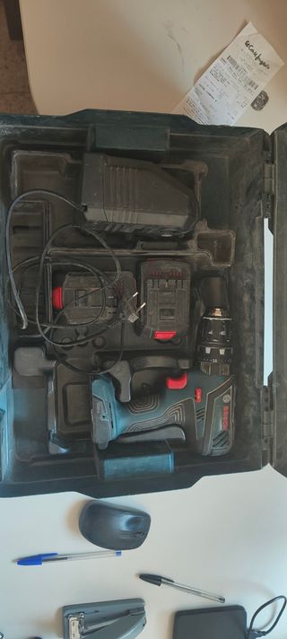 Radial portátil+ taladro profesional percutor portátil+ dos baterias Litio 2Ah+ cargador baterias + maletín rígido.