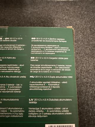 Cargador doble Parkside para baterías de litio de 20V. Permite cargar dos baterías simultáneamente. - Modelo: 20V / 2x 4.5A. - Incluye cargador doble. - Potencia nominal: 220W. - Corriente de carga máxima: 2x 4.5A. - Longitud del cable de alimentación: 2m. - 4 Baterías incluidas. ❌❌Precio fijo❗️ Parkside performance 4 8 12 2 #Perforador #LlaveImpacto #Angular #Baterias #Cargador #HerramientasProfesionales #Obra #Reformas #Construccion #PowerTools #EntregaRapida oferta Milwaukee,Makita, Dewalt,, Bosch, Hilti, Worx, Aeg, Metabo, Einhell, Perfomance, Carpintero, batería, pintura, reforma, obra, metal, Decapadora, percusión, radial,