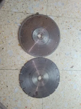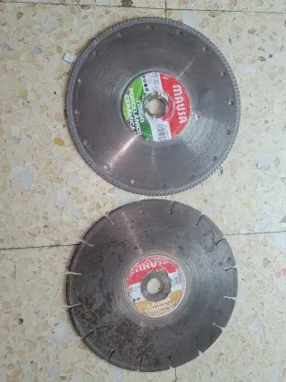 Dos discos de corte para radial, uno para cerámica y otro de uso general. - Disco turbo para porcelánico y cerámica. - Disco de corte láser para uso general.