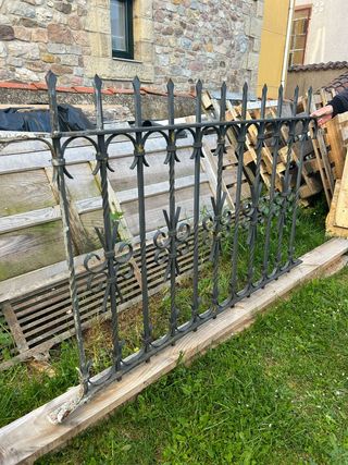 Me gustaria vender esta verja de hierro forjado. - Es de color negro. - Tiene un diseño decorativo. - Ideal para delimitar espacios. - Se encuentra en buen estado.
