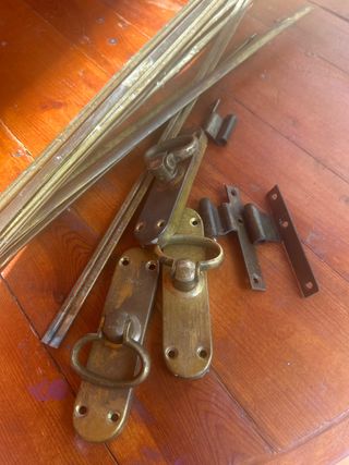 Se venden fallebas antiguas para ventanas y otros herrajes. Son de latón y parecen estar en buen estado, aunque con señales de uso. - 7 fallebas de latón con tirador. - Varios herrajes adicionales incluidos. - Ideales para restauración o decoración. tambien alguna bisagra escucho ofertas