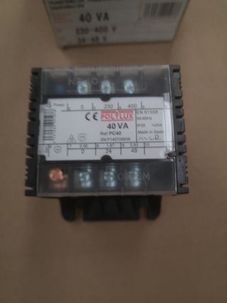 Transformador Polylu PC40 en su caja original. Parece nuevo. - Transformador de 40VA. - Voltaje de entrada: 230-400V. - Voltaje de salida: 24-48V. EAN 8431060991076