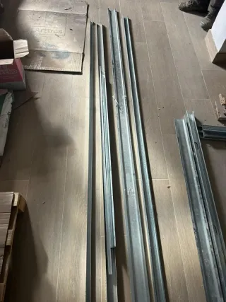 Lote de perfiles metálicos para la construcción de tabiques y techos de pladur. - Material: Acero galvanizado. - Uso: Montaje de estructuras de pladur. Se pueden comprar solos que costaría 5 euros cada perfil y en lotes que dependiendo los que se compren se hace precio.