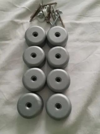 Set de 4 patas cuadradas de 5 x 5 cms para muebles en color gris. Y otro set de 8 patas redondas de 4 cms de diámetro y 2 de alto. - Diseño moderno y funcional. - Fabricadas en plástico resistente. - Incluye tornillos para su instalación.