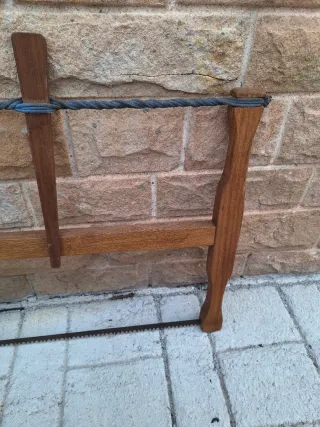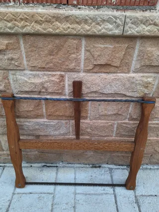 Sierra de carpintero antigua con marco de madera y tensión de cuerda. - Marco de madera. - Tensión de cuerda. - Hoja de sierra dentada.