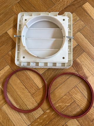 Rejilla de ventilación exterior humo cocina cuadrada de plástico 14 cm x 14 cm blanco para tubo redondo de 10 Incluye dos juntas de goma de estanqueidad de color marrón rojizo para interior del tubo o empalmes nuevas sin uso. Ideal para renovar piezas ventilacion de saldo. - Se vende de saldo