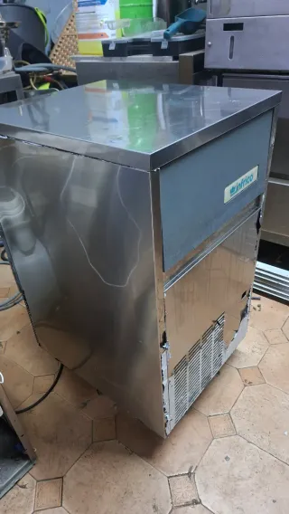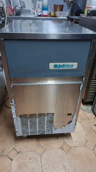Máquina de fabricar hielo de la marca Infrico. Ideal para negocios de hostelería. - Diseño en acero inoxidable y panel frontal gris. - Ruedas para facilitar su movilidad. - Rejilla de ventilación en la parte inferior. -capasidad 45kg /24h