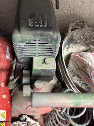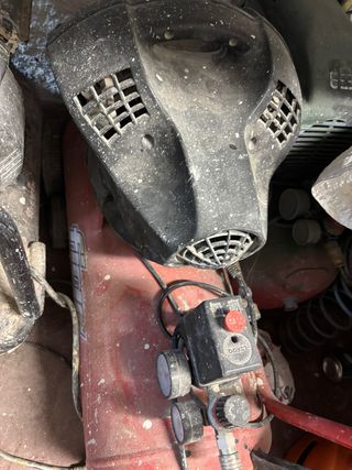 Compresor de aire industrial con tanque rojo. - Motor con rejillas de ventilación. - Panel de control con manómetros y regulador. - Conexiones de aire.
