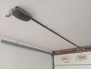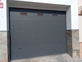 Portón de garaje de color gris, ideal para tu cochera. - Diseño seccional con líneas horizontales. - Incluye rejillas de ventilación. - Asa para apertura manual. - Mide 3 m de ancho y 2.40 cm de alto.