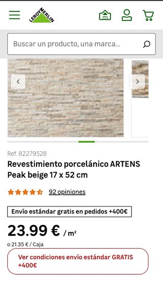 Vendo 3 metros cuadrados de piedra Caliza para recubrimiento de fachadas, decoración de interiores y muros. En Leroy Merlin está a 55'80 el metro cuadrado: Yo vendo los 3 metros cuadrados, completos, a 40€, ya que son una cantidad pequeña, como para una sola pared, y están sin paletizar. (Yo me los traje así, en el maletero del coche. Cabemos perfectamente.) A recoger en Collado Villalba.