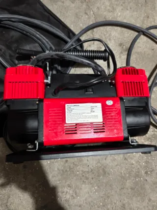 Compresor de aire de alta resistencia, ideal para vehículos todoterreno y uso general. . Compresor de 2 motores, reales, no como algunos que hay a la venta. Es de los que vendia plasma 4x4 hace tiempo. 300 l minuto. Está en perfecto estado, se usaria 3 veces, se vende por no usar - Diseño robusto en color rojo y negro. - Incluye cables de conexión a batería de 12V. - Manguera de aire enrollable.
