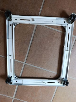 Soporte con ruedas extensible, 46x46 cm / 65x65 cm y 200 kg de carga máxima. Útil para mudanzas o para mover lavadora o secadora, con ruedas para facilitar su desplazamiento. Está en buen estado y es fácil de usar. - Se adapta a diferentes tamaños. - Incluye 4 ruedas giratorias resistentes. - Material: Aluminio resistente. - Patas ajustables para una mayor estabilidad.