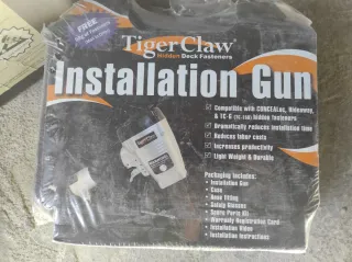 Pistola neumática Tiger Claw Nueva a estrenar. Nunca se ha usado. Conserva el precinto. Su coste de compra fue de cerca de 500€ sin incluir el cubo de tornillos. - Compatible con fijaciones CONCEALoc, Hideaway y TC-G (TC-150). - Reduce drásticamente el tiempo de instalación. - Disminuye los costes de mano de obra. - Aumenta la productividad. - Ligera y duradera. - Incluye: Pistola, maletín etc Regalo cubo con peines de tornillos.