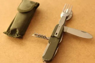 Set de cubiertos multiherramientas para camping y actividades al aire libre. Incluye funda protectora. A estrenar, cualquier duda escribidme hago envíos. - Cuchillo. - Tenedor. - Cuchara. - Sacacorchos. - Funda de tela.