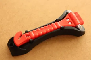 Herramienta multifunción para emergencias en el coche. Combina un rompecristales y un cortador de cinturón de seguridad. - Mango ergonómico de color rojo y negro. - Punta metálica afilada para romper cristales. - Cuchilla integrada para cortar cinturones.