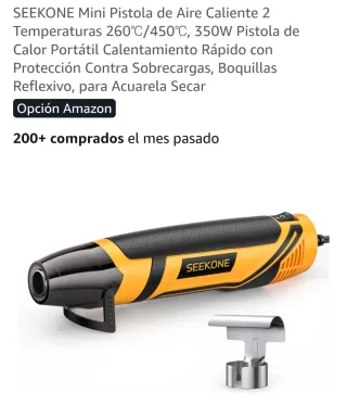 Mini pistola de aire caliente SEEKONE con dos temperaturas. Es portátil y de calentamiento rápido. - Temperatura 1: 260°C - Temperatura 2: 450°C - Potencia: 350W - Protección contra sobrecargas - Incluye boquillas - Color: Amarillo y negro