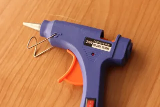 Pistola de silicona de color azul, ideal para manualidades y reparaciones. - Mango ergonómico de color naranja. - Soporte metálico integrado. - Cable de alimentación incluido.