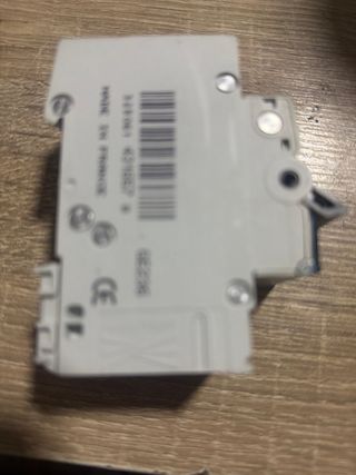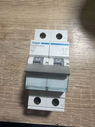 Magnetotérmico de la marca Hager, modelo MUN 510A. - Intensidad nominal: 10A. - Curva de disparo: C. - Tensión asignada de aislamiento: 6000V. - Número de polos: 1.