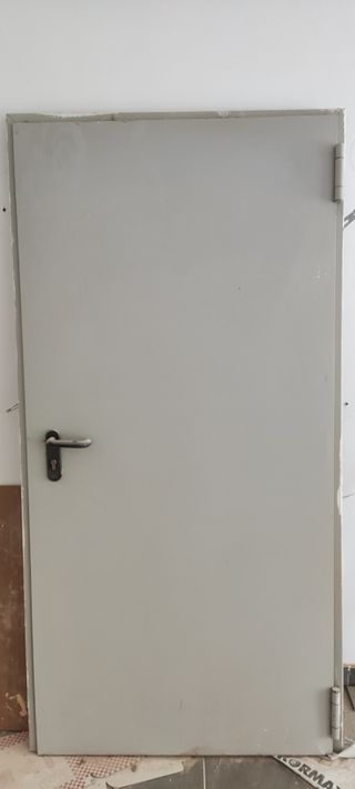 Puerta de emergencia completa, en muy buen estado, medidas 1,00 X 2,20 m. Color gris plata.
