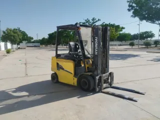 Carretilla elevadora eléctrica marca Hyundai, ideal para la carga y descarga de materiales. Dela año 2017 de 2500 kg eleva 4,70 metros de altura con mástil en reposo de 2,80 metros - Color amarillo. - Diseño robusto.