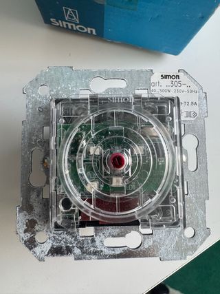 Regulador de intensidad de luz de la marca Simon, serie 75. - Potencia: 40-500W. - Voltaje: 230V~50Hz. - Intensidad: T2.5A. Precio original 70€