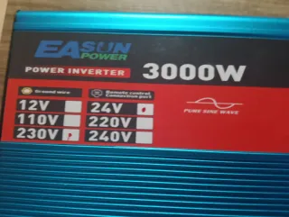 Inversor de corriente de 3000W, diseñado para convertir corriente continua (DC) a corriente alterna (AC). Su carcasa es de color azul metálico. - Potencia: 3000W - Voltaje de entrada: 24V - Voltaje de salida: 110V/220V/230V/240V - Incluye cables de conexión y manual de usuario