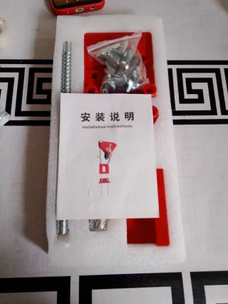 Kit de taladro de perforación para mesa. Incluye todas las piezas necesarias para su montaje. - Base roja con soporte para rodamiento. - Varilla metálica roscada. - Bolsa con tornillos y tuercas. - Pieza roja adicional. - Componente metálico envuelto.