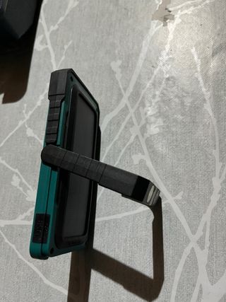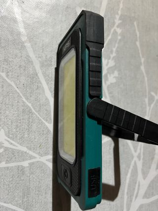 Linterna portátil con luz LED y conexión USB. - Diseño robusto en color verde y negro. - Puerto USB para carga.