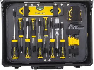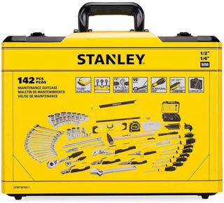 Maletín de mantenimiento Stanley con 142 piezas. Incluye una variedad de herramientas esenciales para reparaciones y mantenimiento general. - Maletín de aluminio resistente. - Herramientas de acero al cromo vanadio. - Incluye llaves, destornilladores, martillo y más.