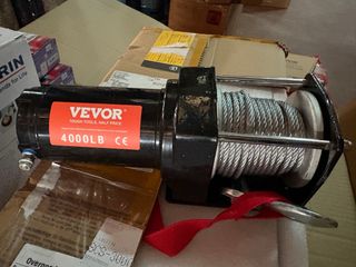 Cabrestante eléctrico VEVOR con capacidad de 4000LB. - Color negro. - Incluye cable de acero. - Etiqueta VEVOR con TOUGH TOOLS, HALF PRICE.