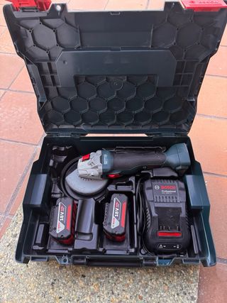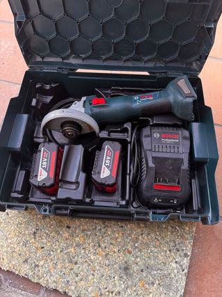 Se vende amoladora Bosch GWS 18V-10 en su maletín. - Incluye dos baterías de 18V. - Cargador Bosch Professional. - Maletín de transporte.