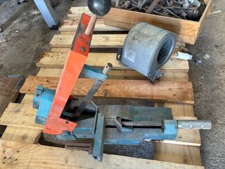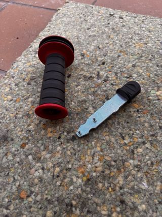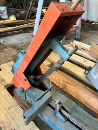 Accesorio para convertir tu taladro en una sierra. - Estructura metálica azul y naranja. - Palanca de accionamiento. - Mordaza ajustable.