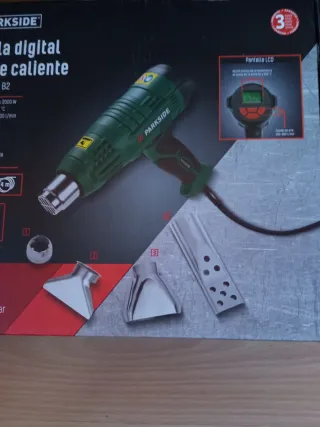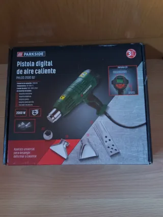 Pistola de aire caliente digital Parkside PHLGD 2000 B2. Ideal para despegar, deformar o calentar. - Potencia: 2000 W - Temperatura: 50-650 °C - Caudal de aire: 250-500 l/min - Incluye accesorios: boquilla reductora, boquilla espiral, boquilla plana y rasgador de pintura. - Pantalla LCD.