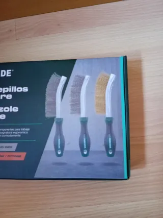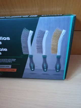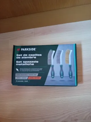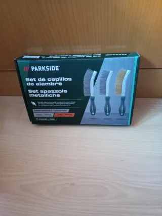 Set de tres cepillos metálicos de la marca Parkside. Cuentan con mangos ergonómicos de 2 componentes para un mejor agarre. - Cepillo de acero inoxidable. - Cepillo de latón. - Cepillo de nylon.