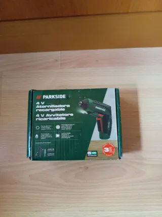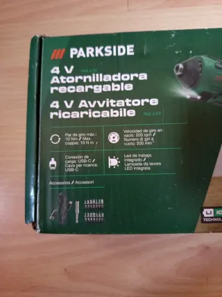 Atornillador recargable Parkside de 4V. - Par de giro máximo: 10 Nm. - Velocidad de giro en vacío: 200 rpm. - Conexión de carga USB-C. - Luz de trabajo LED integrada. - Incluye accesorios.