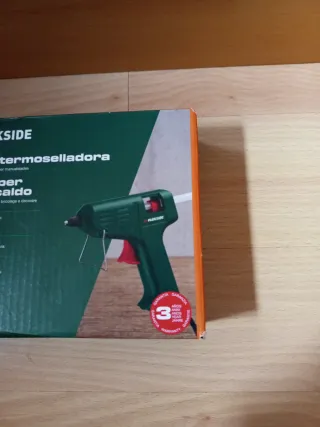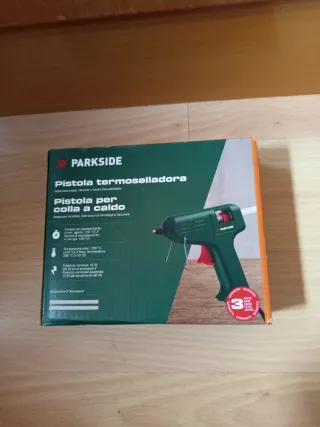 Pistola de silicona Parkside para manualidades y reparaciones. - Tiempo de calentamiento: aprox. 4 min. - Temperatura máxima: 200 °C. - Potencia nominal: 15 W (60 W al arranque). - Incluye accesorios.