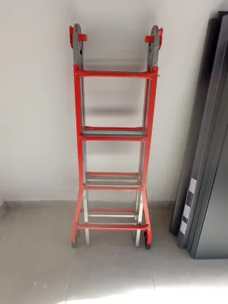 Escalera plegable de color rojo, ideal para trabajos en casa o en el jardín. Su diseño permite guardarla fácilmente. - Estructura de metal resistente. - Peldaños antideslizantes. Y se puede doblar Se recoge en San Sebastián de los Reyes o en Colmenar Viejo, Madrid