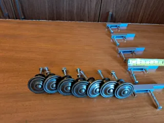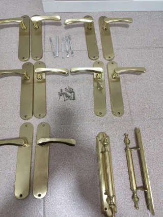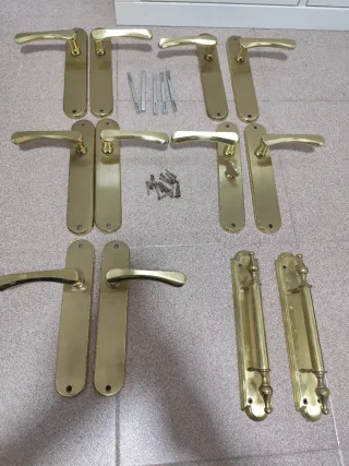 Lote de manillas para puertas interiores en acabado dorado. Incluye varios juegos y accesorios. - Acabado dorado brillante. - Diseño clásico para puertas interiores. - Incluye tornillería y pasadores. 4 iguales 1 con condena para puerta de cuarto de baño 1 juego para puerta corredera 1 para puerta de entrada interior 5€ unidad, si se llevan todas 30 euros Precio negociable Se hace envío