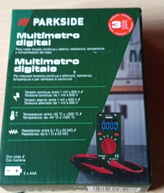 Multímetro digital Parkside para medir tensión continua y alterna, resistencia y temperatura. - Rango de tensión continua: 1 mV a 600 V. - Rango de tensión alterna: 1 mV a 600 V. - Rango de temperatura: -40 °C a +300 °C. - Rango de resistencia: 0,1 Ω a 20 MΩ. - Incluye 2 pilas AAA.