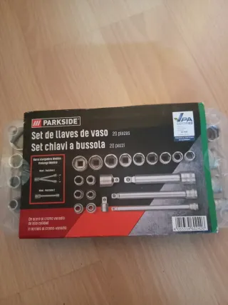 Set de 20 llaves de vaso de la marca Parkside. Fabricadas en acero al cromo-vanadio de alta calidad. - Incluye barra alargadora Wobble. - Incluye 2 extensiones (Posición 1 y Posición 2). - Juego de vasos de diferentes tamaños.