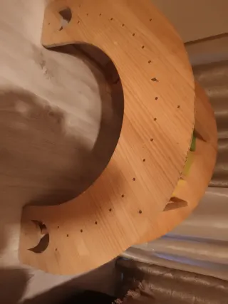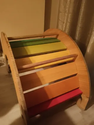Arco de madera para niños con diseño colorido y seguro. - Estructura de madera natural. - Escalones de colores: verde, amarillo, naranja y rojo. - Barras de sujeción de madera.