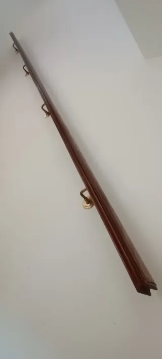 Barandilla de madera oscura, ideal para escaleras o pasillos. Cuenta con soportes metálicos para su fijación a la pared. DOS BARANDILLAS DISPONIBLES. PRECIO NEGOCIABLE. - Material: Madera. - Color: Oscuro. - Soportes: Metálicos. Medidas: 3.87m x 7 cm
