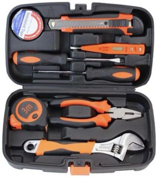 Práctico set de herramientas para reparaciones básicas y trabajos eléctricos. Incluye una variedad de herramientas esenciales. - Cinta aislante - Cúter - Destornillador de precisión - Voltímetro - Alicates - Llave inglesa - Cinta métrica