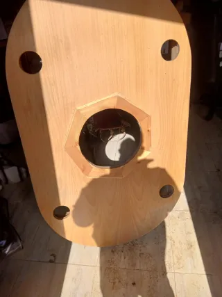 Tarima de madera para mesa. Presenta un diseño con un hueco central octogonal y cuatro orificios circulares en las esquinas. - Material: Madera - Forma: Rectangular con bordes redondeados - Hueco central octogonal - Cuatro orificios circulares