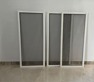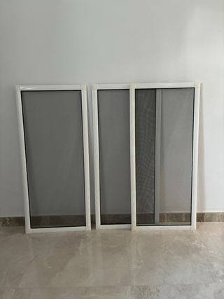 Conjunto de tres mosquiteras para ventanas, listas para instalar. - Marcos de aluminio blanco. - Malla de fibra de vidrio gris. - Ideales para proteger tu hogar de insectos. - Medidas 106x48