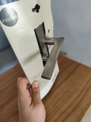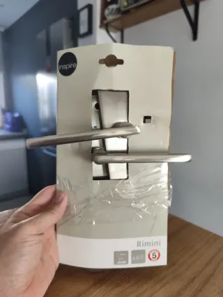 Juego de picaportes modelo Rimini de la marca Inspire. - Acabado en metal plateado. - Diseño moderno y elegante. - Incluye todos los elementos necesarios para su instalación.