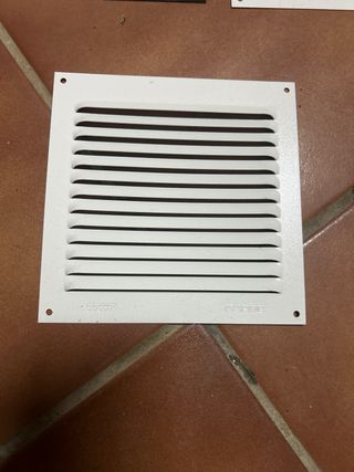 Pack de 6 rejillas de ventilación cuadradas de color blanco. Son ideales para conductos de aire. - Material: Aluminio lacado - Color: Blanco. - Medidas: 15x15 cm aprox.