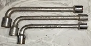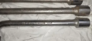 Set de tres llaves de tubo de la marca Palmera, fabricadas en España. Son herramientas manuales con un diseño en L. - Medidas: 21 mm , 22 mm, 24 mm. - Material: Metal. - Fabricación: España.