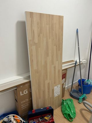 Tablero de madera con acabado imitación madera clara, ideal para usar como superficie de mesa. - Diseño de lamas de madera. - Borde blanco.