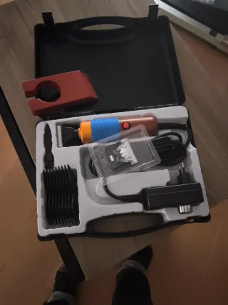 Cortadora de pelo eléctrica con accesorios, ideal para trabajos de tufting. Incluye todo lo necesario para empezar. - Cortadora con mango ergonómico. - Cuchillas de repuesto. - Peines guía de diferentes tamaños. - Cepillo de limpieza. - Adaptador de corriente.
